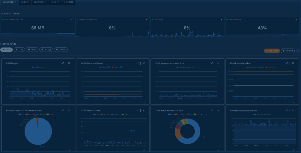 Track critical metrics like CPU, memory, disk usage, and database performance, live and without delay.
