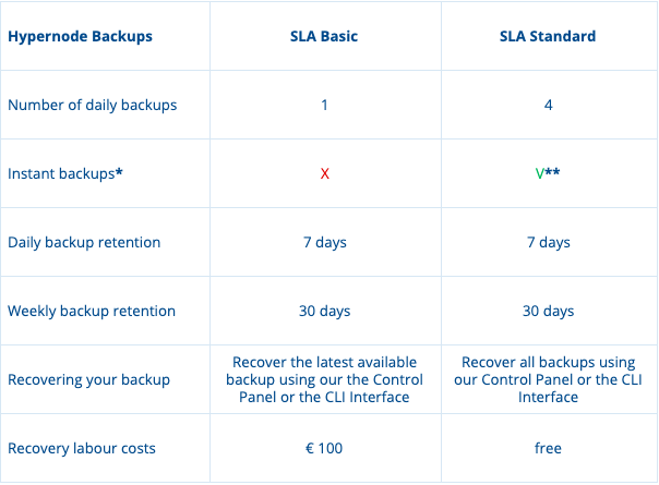 We’ve added the additional backup features as a part of our Service Level Agreement (SLA) policy. The table below shows the differences regarding backups between SLA Basic and SLA Standard. If you’re looking for more technical details, read this article about our SLA backup policies.